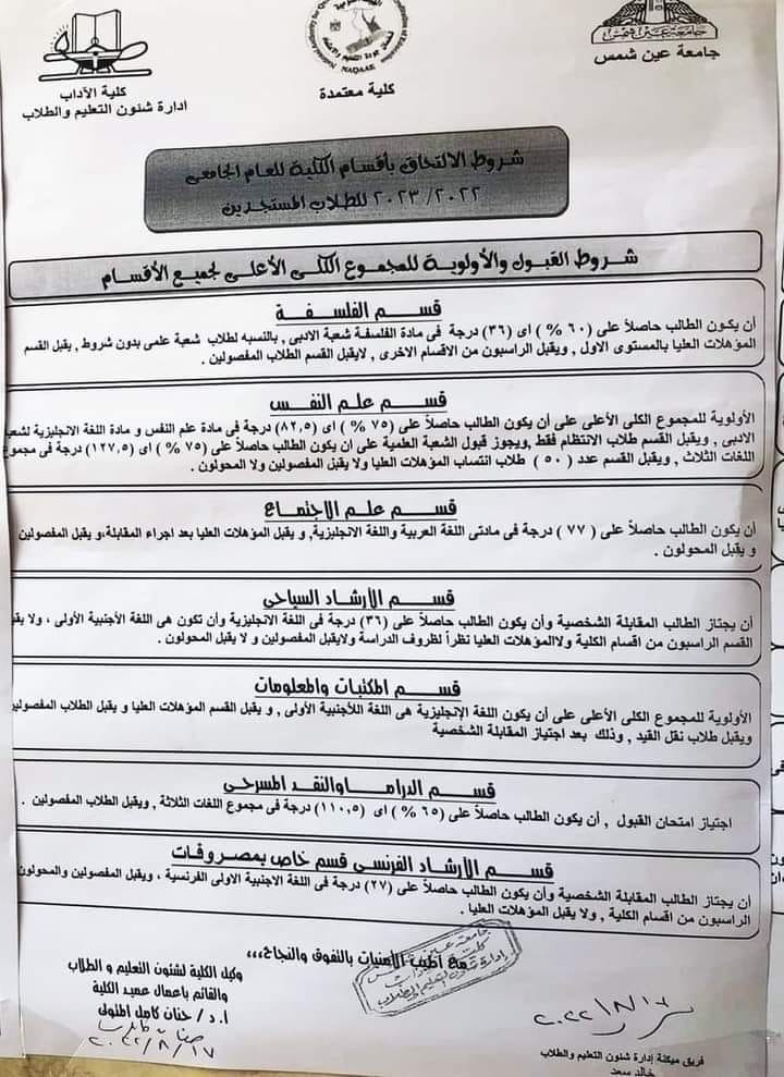 في هذا المقال ننشر للطلاب كافة شروط الالتحاق بأقسام كليات الاداب جامعة عين شمس للعام الجامعي 2022-2023.